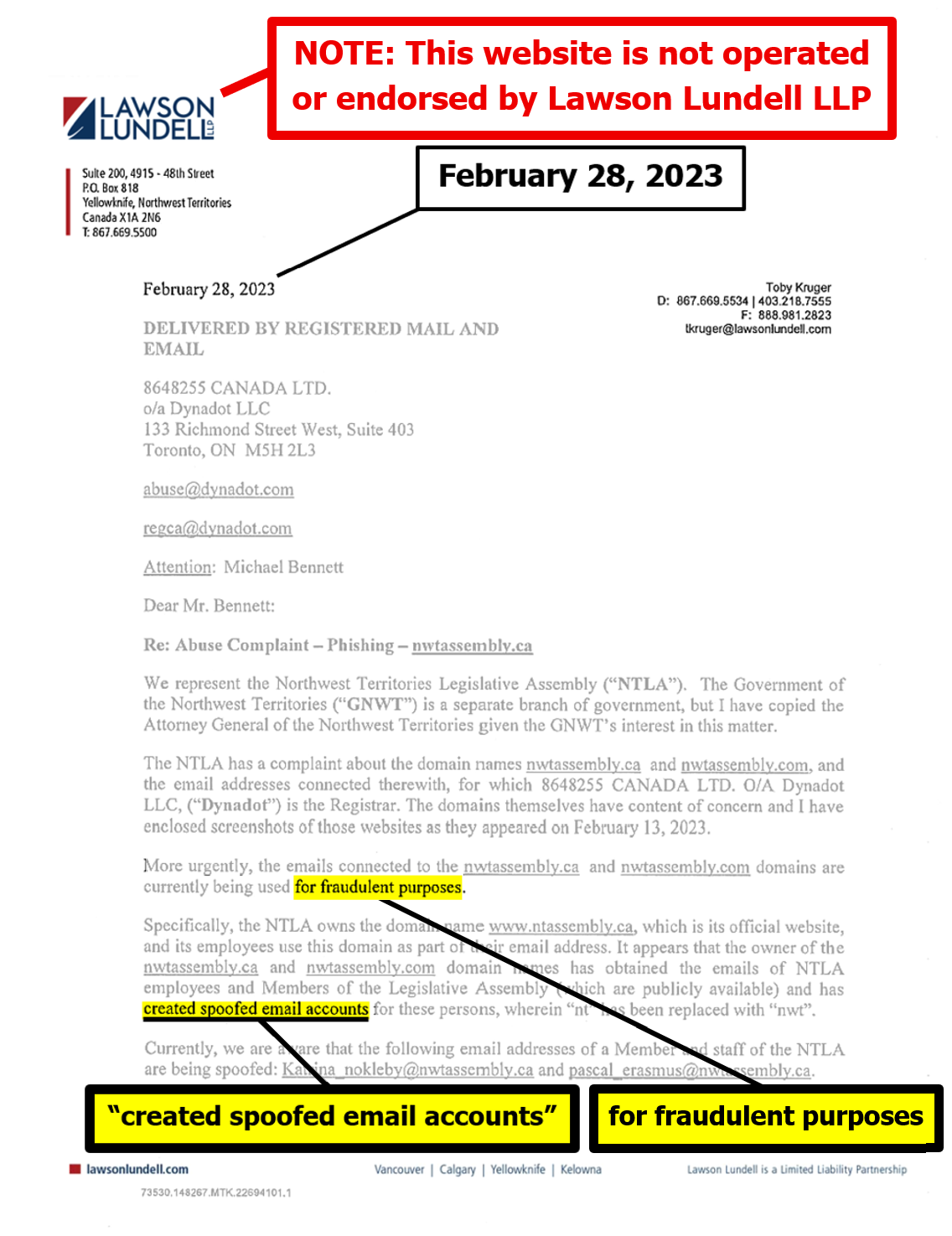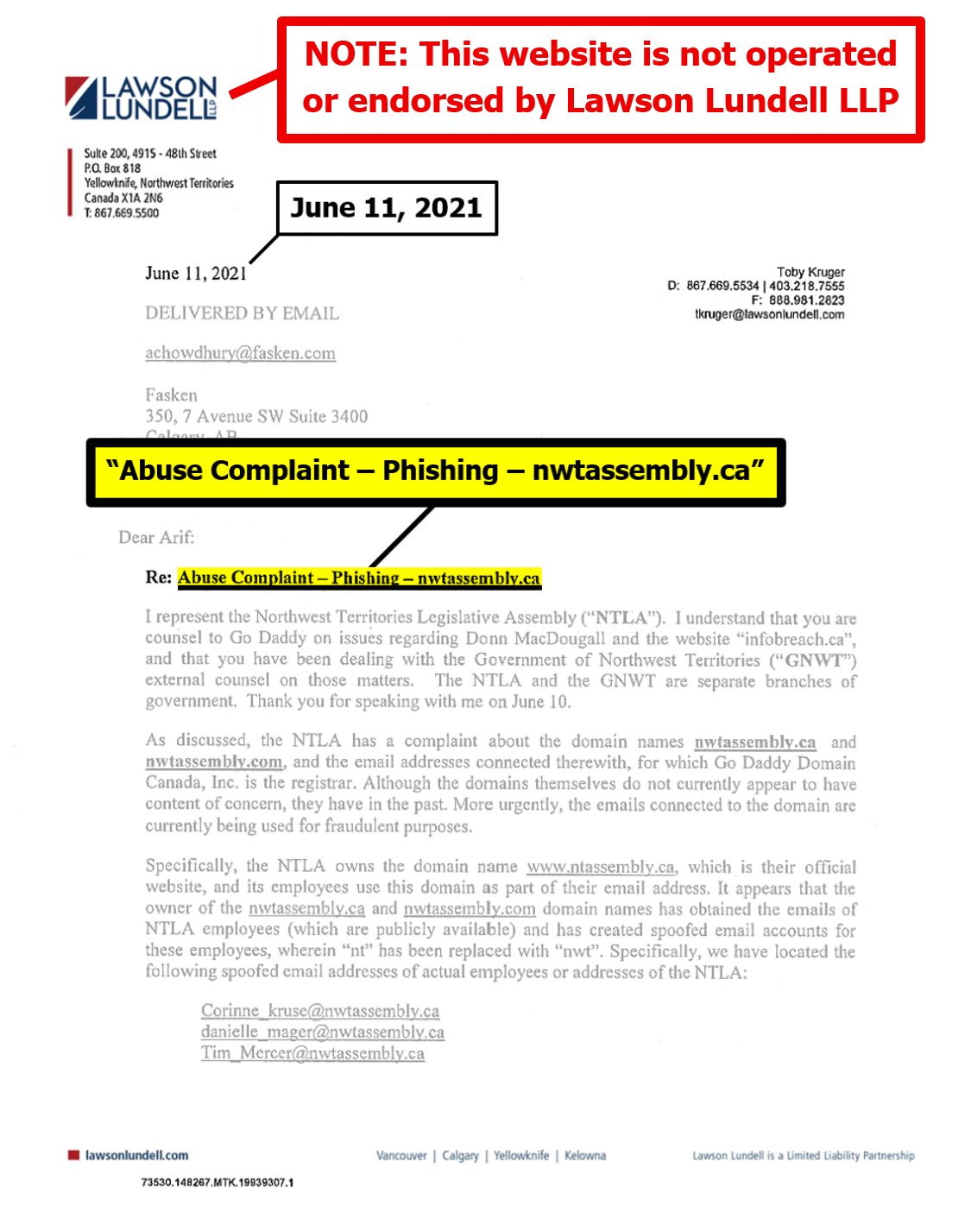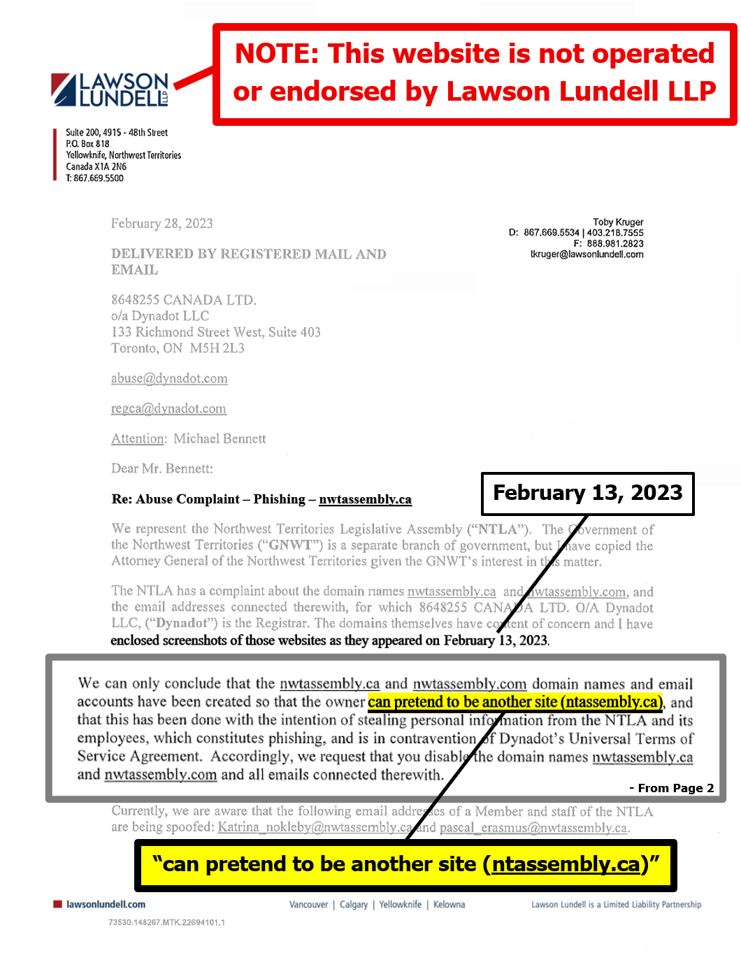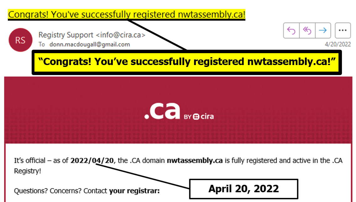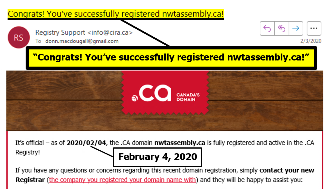 "the NTLA owns the domain name www.ntassembly.ca" is FALSE: