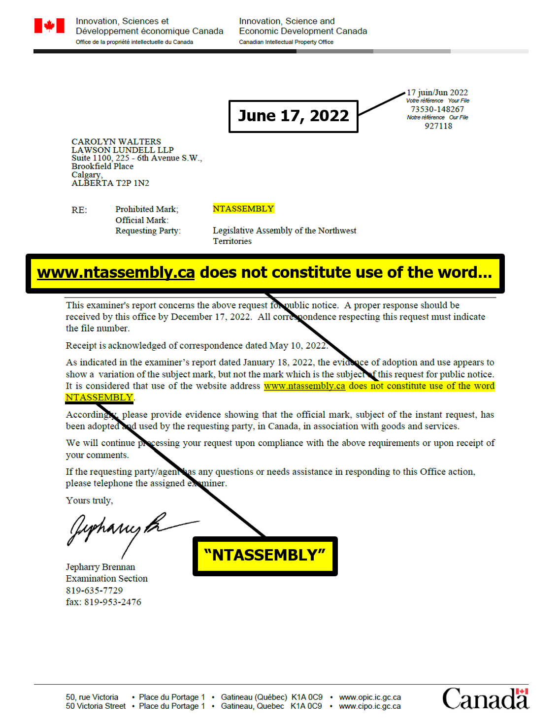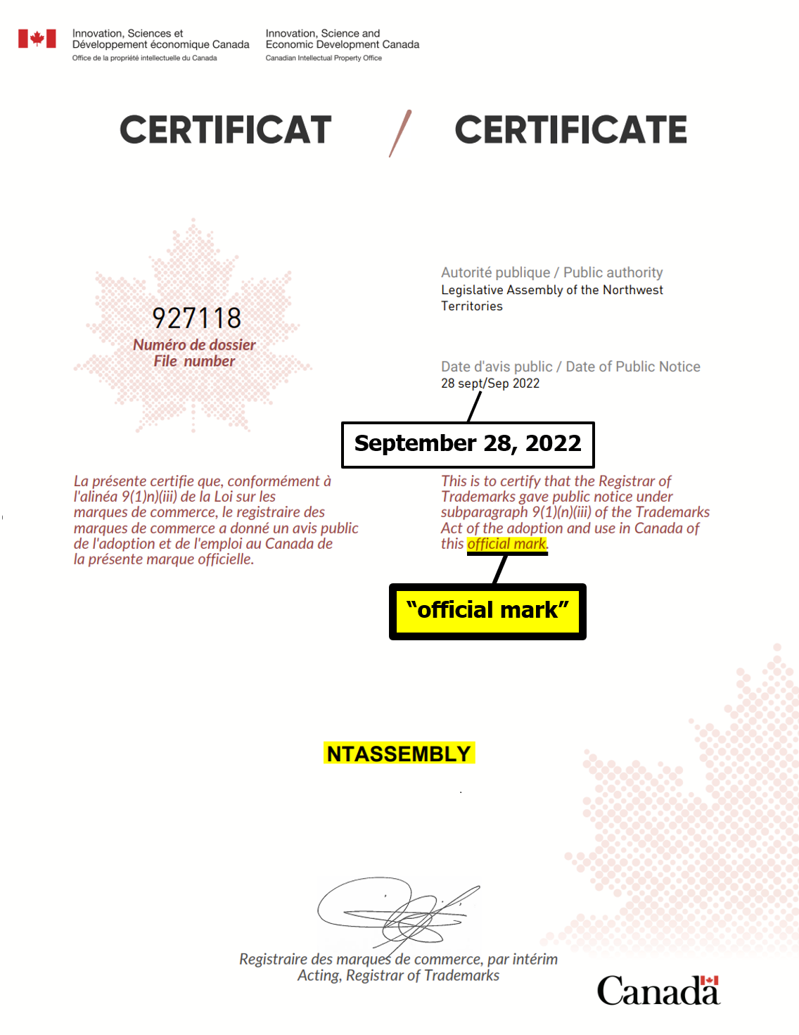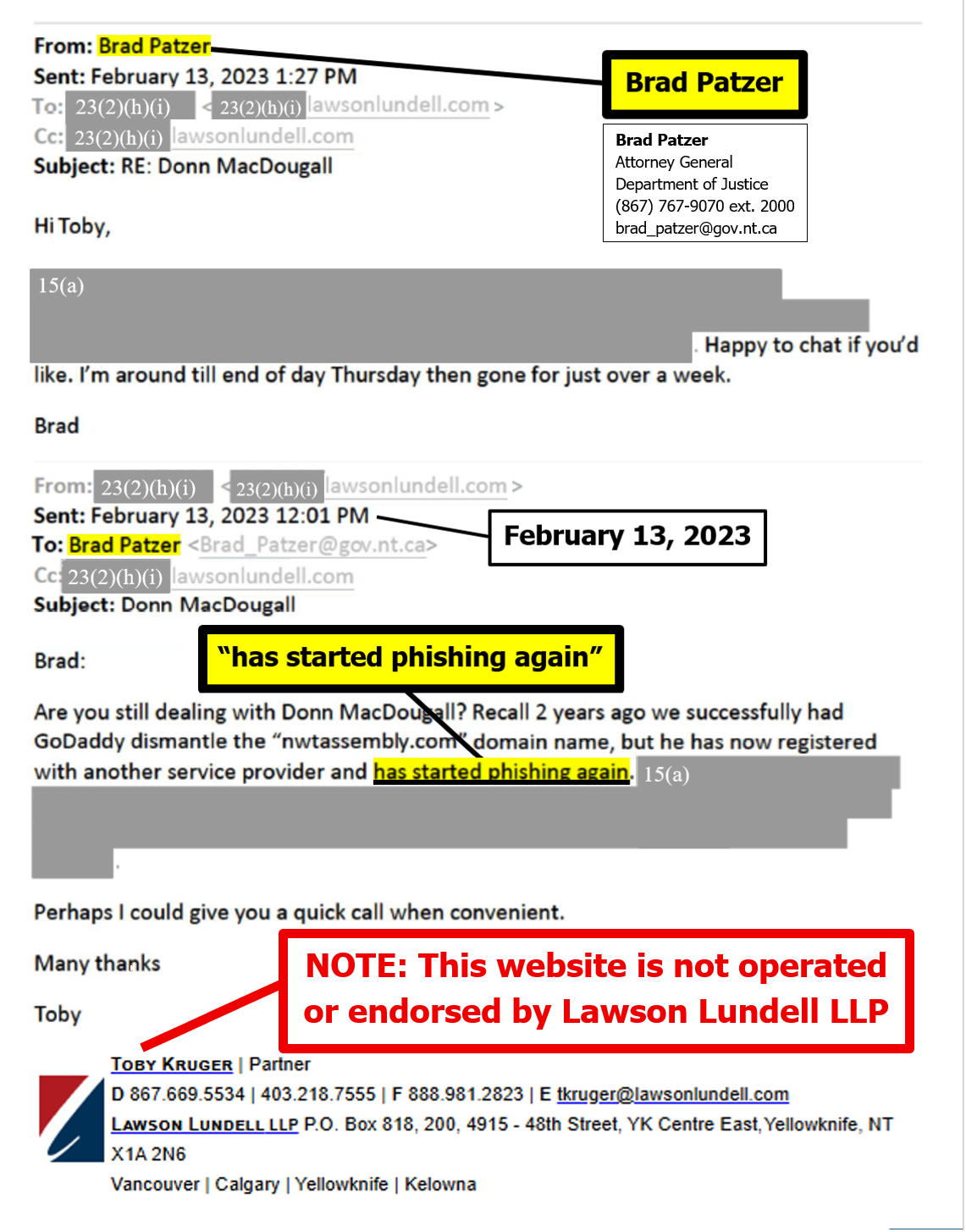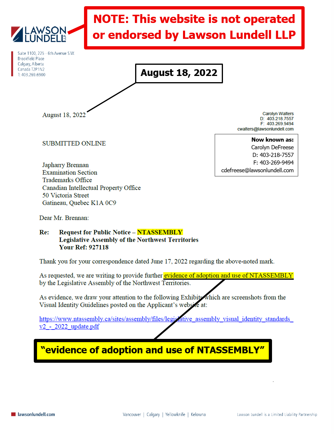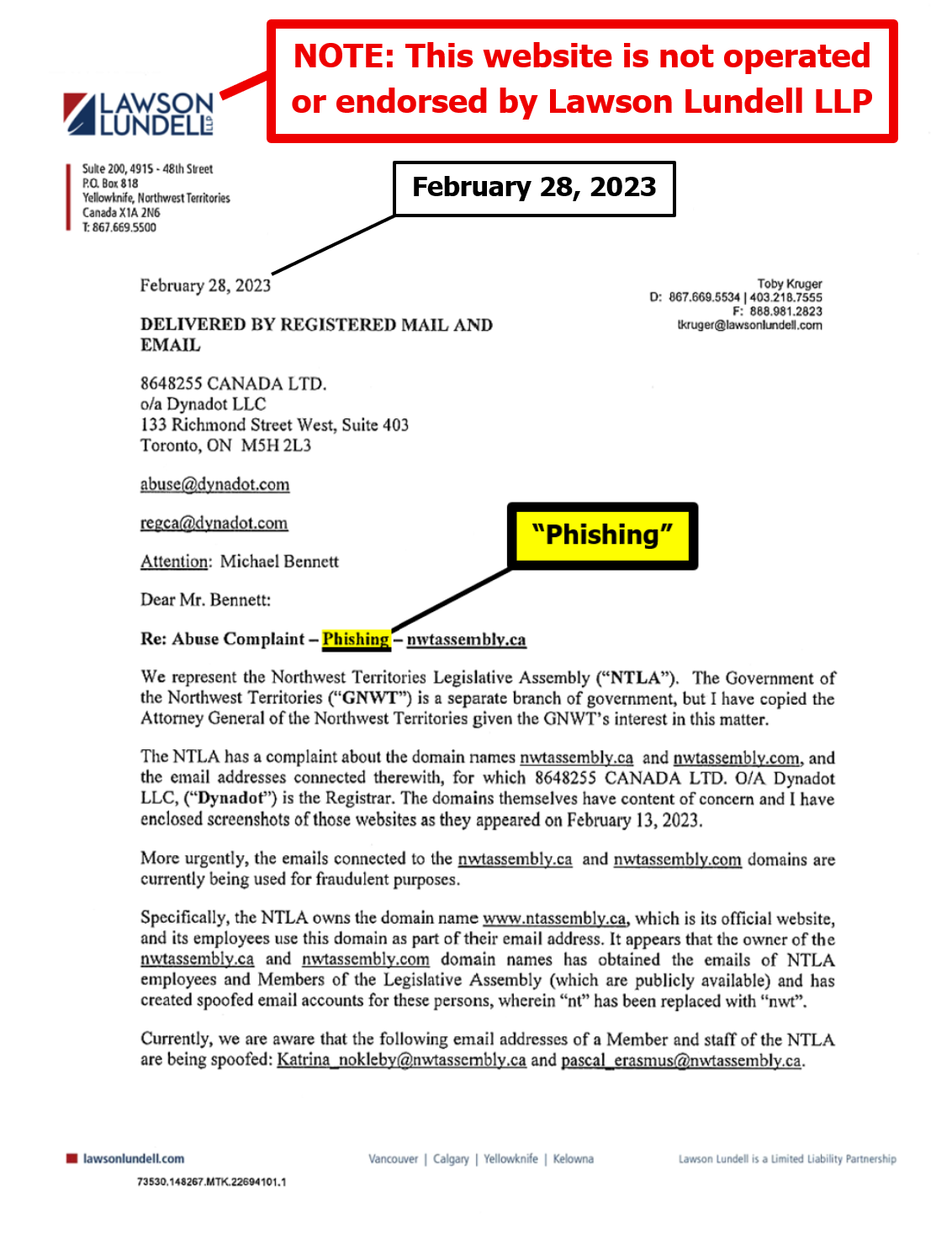 "the NTLA owns the domain name www.ntassembly.ca" is FALSE: